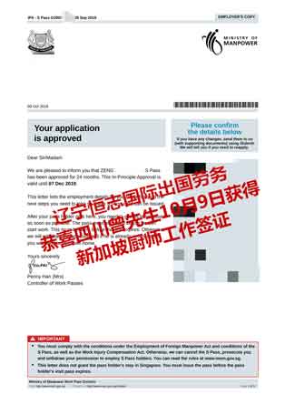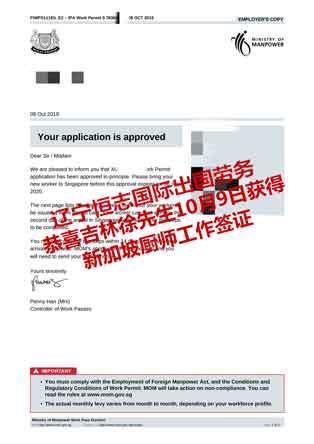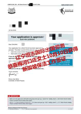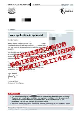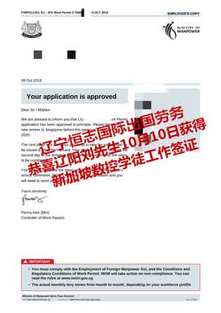 恭喜宽甸姜先生获新加坡工厂普工工签
