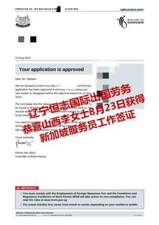 恭喜山西李女士获新加坡服务员工签