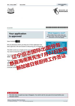 恭喜海南黄先生获新加坡日餐厨师工工签