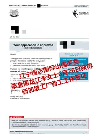 恭喜黑龙江李女士获新加坡工厂普工工签