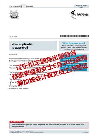 恭喜安徽肖女士获新加坡会计兼文员工签