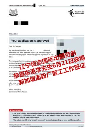 恭喜珲春刘先生获新加坡KTV服务员工签